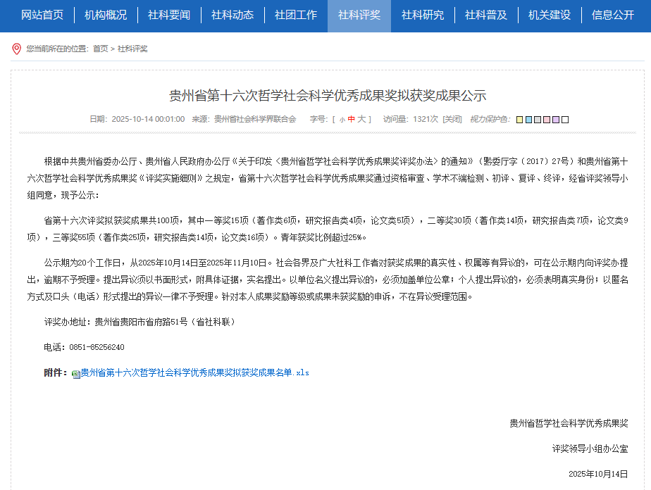 据了解,贵州省哲学社会科学优秀成果奖是贵州省哲学社会科学类成果最高奖,每两年举行一届,并以贵州省人民政府名义予以奖励。本次获奖作品内容涵盖了哲学研究、社会问题研究、贵州特色产业和文化研究等诸多领域。除了贵州学者,还有来自省外院校专家研究贵州的学术成果获奖,此外,青年学者获奖的比例超过四分之一。