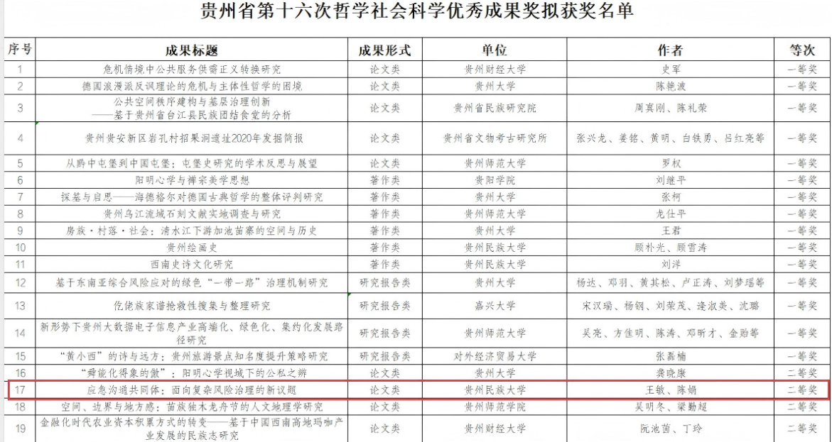据悉,本次评选通过资格审查、学术不端检测、初评、复评、终评、公示等环节,从1151项成果中评选出100项,其中一等奖15项,二等奖30项,三等奖55项。我们王敏老师的论文《应急沟通共同体:面向复杂风险治理的新议题》荣获二等奖。
